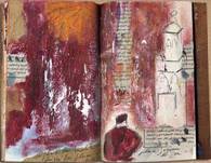 Christine explore le monde du collage et de la peinture depuis de nombreuses années. Sur une toile, sur une enveloppe ou dans un carnet, c’est toujours la même histoire, une histoire de matières qu’elle aime déchirer, froisser, couper, gratter, poncer… Une histoire de matières récoltées au fil de ses balades, ramenées de ses voyages, dénichées dans des vide-greniers. Une histoire de matières qu’elle conserve dans des boîtes qui s’empilent, classées par thème : écriture, timbres, cartes routières, affiches déchirées, vieux papiers, archives familiales. Ses carnets sont pour la plupart des carnets de voyages intérieurs. Elle y laisse parler ses mains, qui disent ce que ses mots ne peuvent pas dire. Les écritures sont illisibles mais omniprésentes.