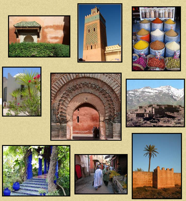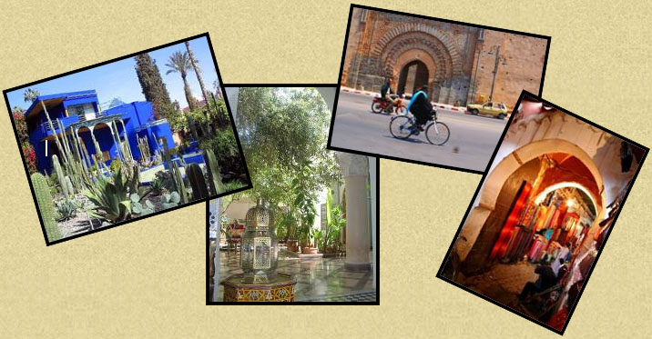 Marrakech, ville impériale aux remparts de pisé rouge est une ville fabuleuse. C’est également une ville aux contrastes permanents entre l’agitation bruyante et multicolore des souks de la Medina ou de la place Jemaâ El Fna et le calme reposant des jardins et patios richement décorés.