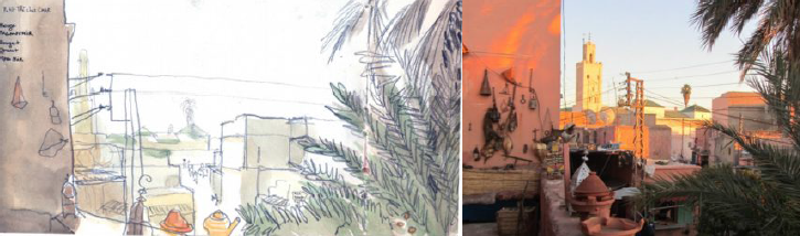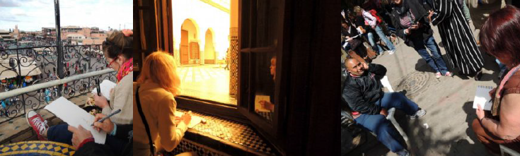 Cette session sera suivie d'un temps libre. Nous nous retrouverons l'après-midi pour une découverte « déambulation carnets à la main » dans un quartier de Marrakech (par exemple : place Jamaâ El Fna, musée de la photographie, quartier des tanneurs, place des ferblantiers, caravansérail, remparts)... ponctuée de pauses /dessin en terrasse ou de temps de visites.