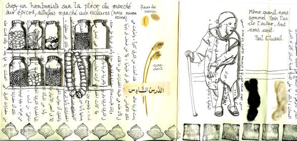 Une semaine pour découvrir et acquérir la technique du carnet de voyage, et se faire plaisir en créant un carnet d’émotions, unique et à son image. Le support sera un carnet accordéon Moleskine. Sur le recto, on mêlera collages et dessins réalisés au feutre noir, à l’encre de chine indélébile ou au brou de noix. Le carnet réalisé sera graphique, mêlant des images marocaines (journaux, emballages alimentaires...) et un dessin « au trait ».