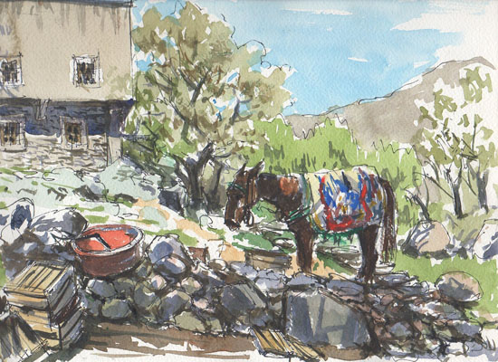 Passage sur le chemin par Tagnahout ( beau village authentique à la sortie de Tagnahout : pause peinture ) et par des gorges et un col ( pause peinture avec chevaux et dromadaires au bord de la riviere / pause thé dans les petits cafés sympas ) puis par Asni ( pause peinture cigognes à l’entrée de Asni )