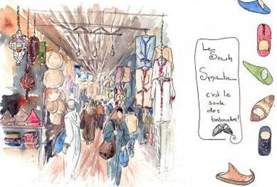 Matinée : visite et prises de croquis rapides dans les souks : souk des babouches, souk des teinturiers, épices etc….
