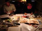 Les ateliers de la fin d’après-midi porteront sur la couleur et les valeurs, adaptées aux différents aspects du carnet de voyage (perspective, composition, graphisme, matériaux, texte, etc.).