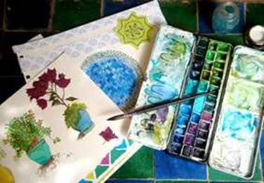 Marché aux vieux livres et début de la collecte, marché artisanal. Déjeuner puis exercices pratiques au Riad et découverte de l’aquarelle.