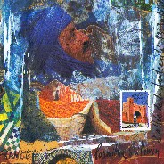 Christine explore le monde du collage et de la peinture depuis de nombreuses années. Sur une toile, sur une enveloppe ou dans un carnet, c’est toujours la même histoire, une histoire de matières qu’elle aime déchirer, froisser, couper, gratter, poncer… Une histoire de matières récoltées au fil de ses balades, ramenées de ses voyages, dénichées dans des vide-greniers. Une histoire de matières qu’elle conserve dans des boîtes qui s’empilent, classées par thème : écriture, timbres, cartes routières, affiches déchirées, vieux papiers, archives familiales. Ses carnets sont pour la plupart des carnets de voyages intérieurs.