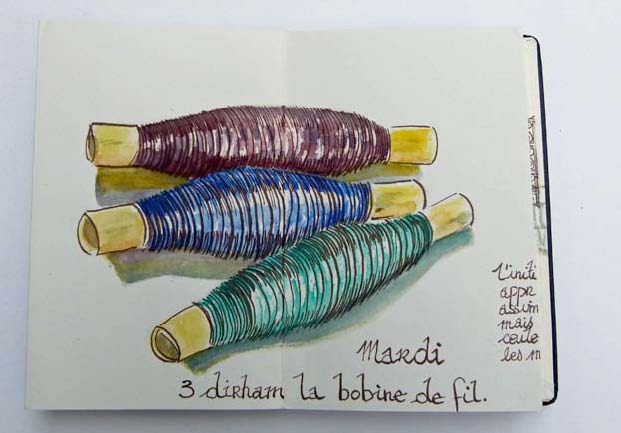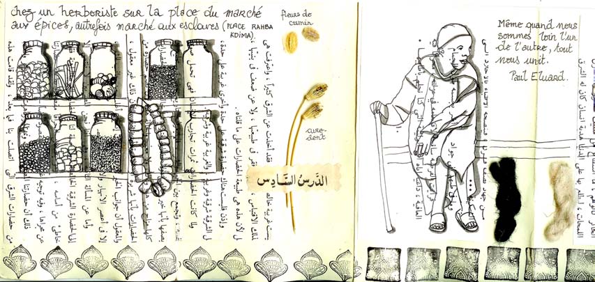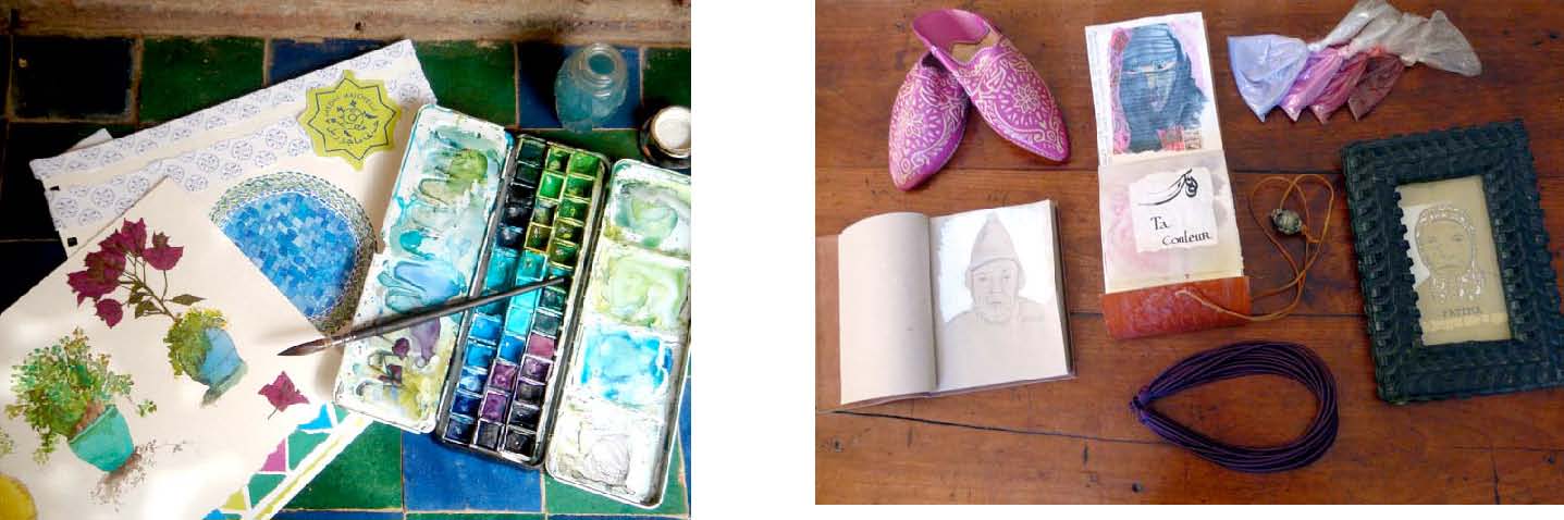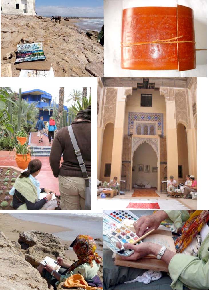 Matin Inventaire des désirs et attentes de chacun, Marché aux vieux livres et début de la collecte. Marché artisanal. Découverte rapide des souks (possibilité d’acheter un carnet en cuir) Après midi exercices pratiques au Riad. Découverte de techniques de mise en page, préparation du carnet, frottages, estampages, tampons.